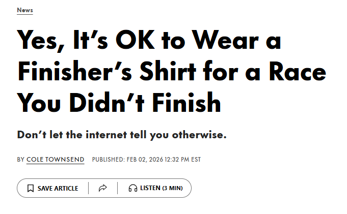 This past February 2nd, a controversy was sparked by an article that ran on the Runner’s World website. It was an opinion piece by a writer named Cole Townsend (whom I don’t know). The piece was titled: “Yes, It’s OK to Wear a Finisher’s Shirt for a Race You Didn’t Finish”. Hence, the rebuttal in the title of this blog post.